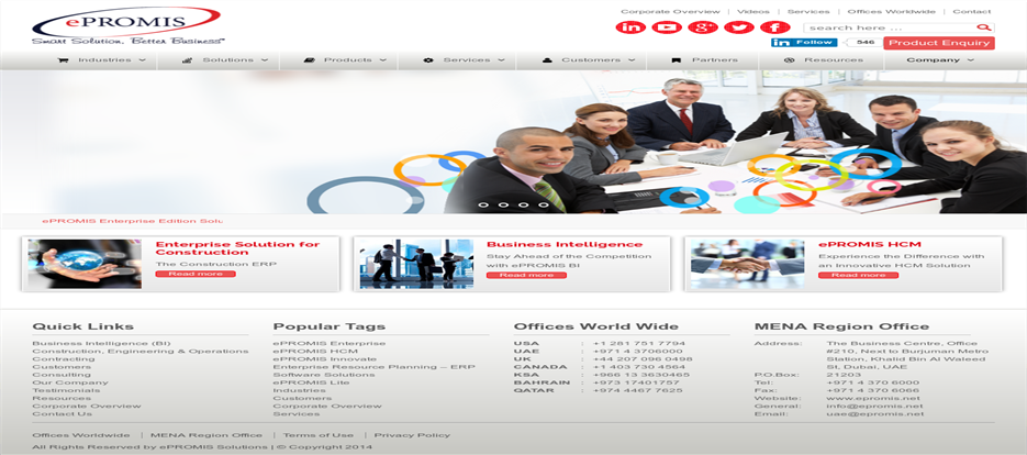 ePROMIS Solutions, inşaat, taahhüt, petrol ve gaz, MEP(Mekanik, Elektrik ve Su tesisatı), ticaret, üretim, tedarik zinciri, otomobil, ulaştırma, sağlık, kamu sektörü ve daha fazlası konularda kurumsal yazılım çözümleri sunan bir yazılım firmasıdır.